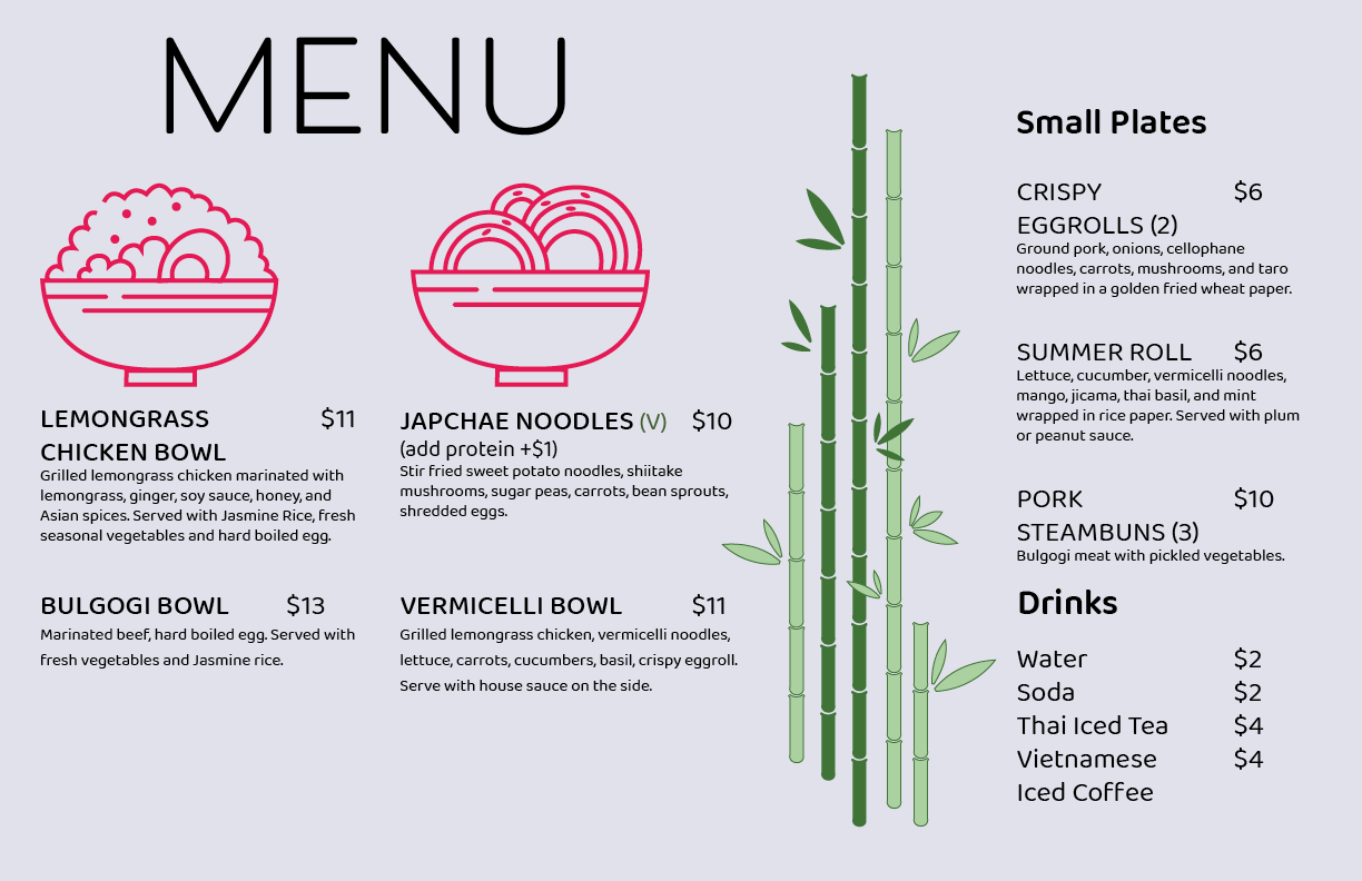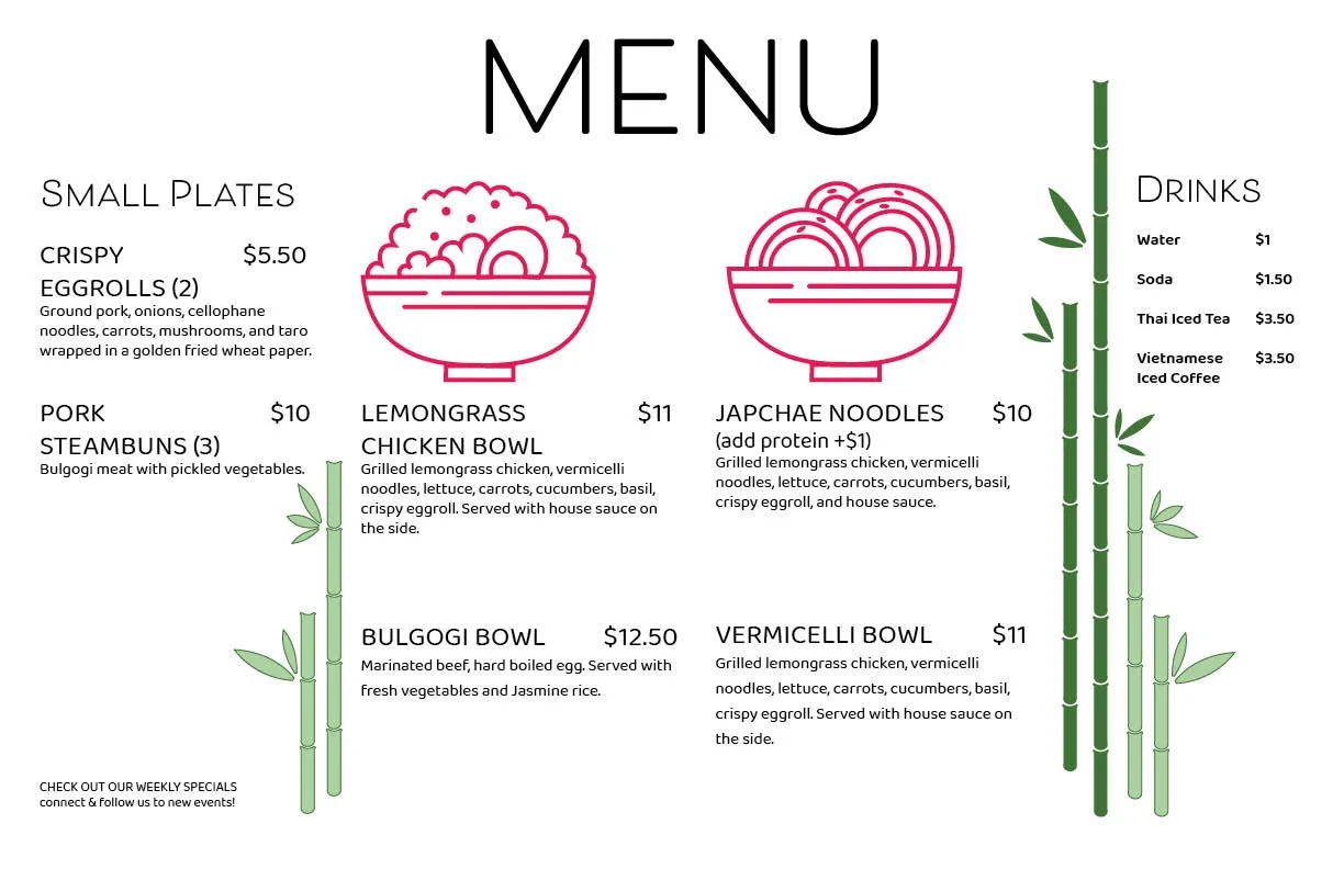 Client Objective: Initially, the client sought a straightforward horizontal menu with illustrations to distinguish food offerings, considering the backdrop of her food cart wrap.