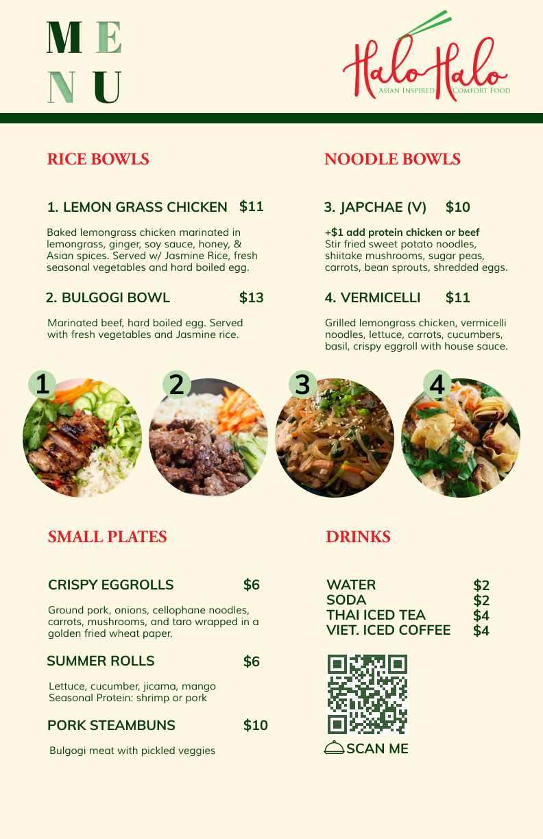 Project Initiation: Conducted a thorough review of Halo Halo Food Cart's online and offline assets, identifying a lack of cohesive branding and visually appealing menus. Consulted with the owner to understand business values.