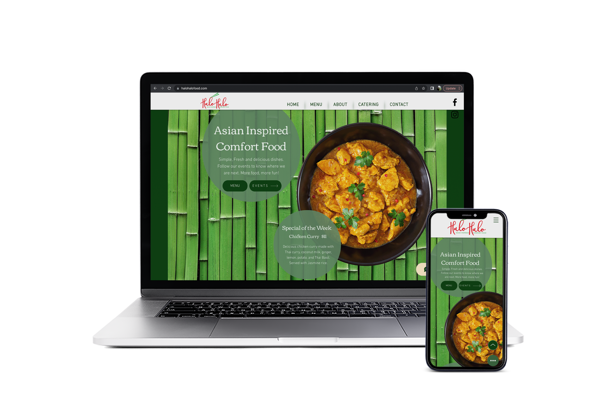 The homepage strategically highlights Halo Halo Food Cart's key features and offerings, with a strong focus on the weekly specials. Clear 'MENU' and 'EVENTS' buttons ensure user-friendly navigation and information.